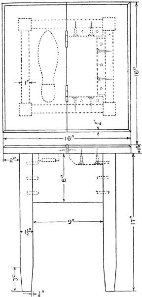 The shoe rest can be made from a block of wood and covered with sheet tin, copper or brass, or a cast-iron rest can be purchased. The rest is fastened to the under side of the hinged top. Stain the wood any dark color and apply a very thin coat of shellac. Put on wax and you will have a finish that can be renewed at any time by wiping with a little turpentine and rewaxing.