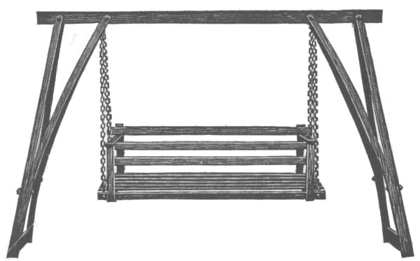 The coming of spring and summer calls forth various kinds of porch and lawn furniture. A porch or lawn swing to accommodate two or more persons is a thing desired by most people. The lawn swing as shown in the picture is portable and does not need stakes to hold it to the ground. While this swing is substantial and rigid it can be moved from place to place on the lawn, or the chains can be fastened with heavy hooks to the ceiling of a porch instead of using the stand. Either ropes or chains may be used to hang the swing and should be of such length that the seat will be about 20 in. from the ground or floor.[48]