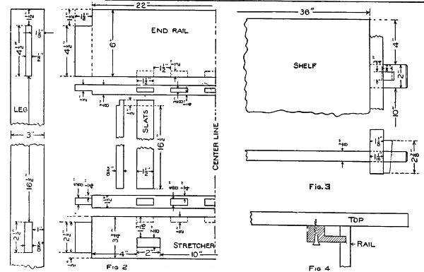 The drawings obviate any necessity for going into detail in the description. Fig. 1 gives an assembly drawing showing the relation of the parts. Fig. 2 gives the detail of an end. The tenons for the side rails are laid off and the mortises placed in the post as are those on the end. Care must be taken, however, not to cut any mortises on the post below, as was done in cutting the stretcher mortises on the ends of the table. A good plan is to set the posts upright in the positions they are to occupy relative to one another and mark with pencil the approximate positions of the mortises. The legs can then [32] be laid flat and the mortises accurately marked out with a fair degree of assurance that they will not be cut where they are not wanted and that the legs shall "pair" properly when effort is made to assemble the parts of the table.